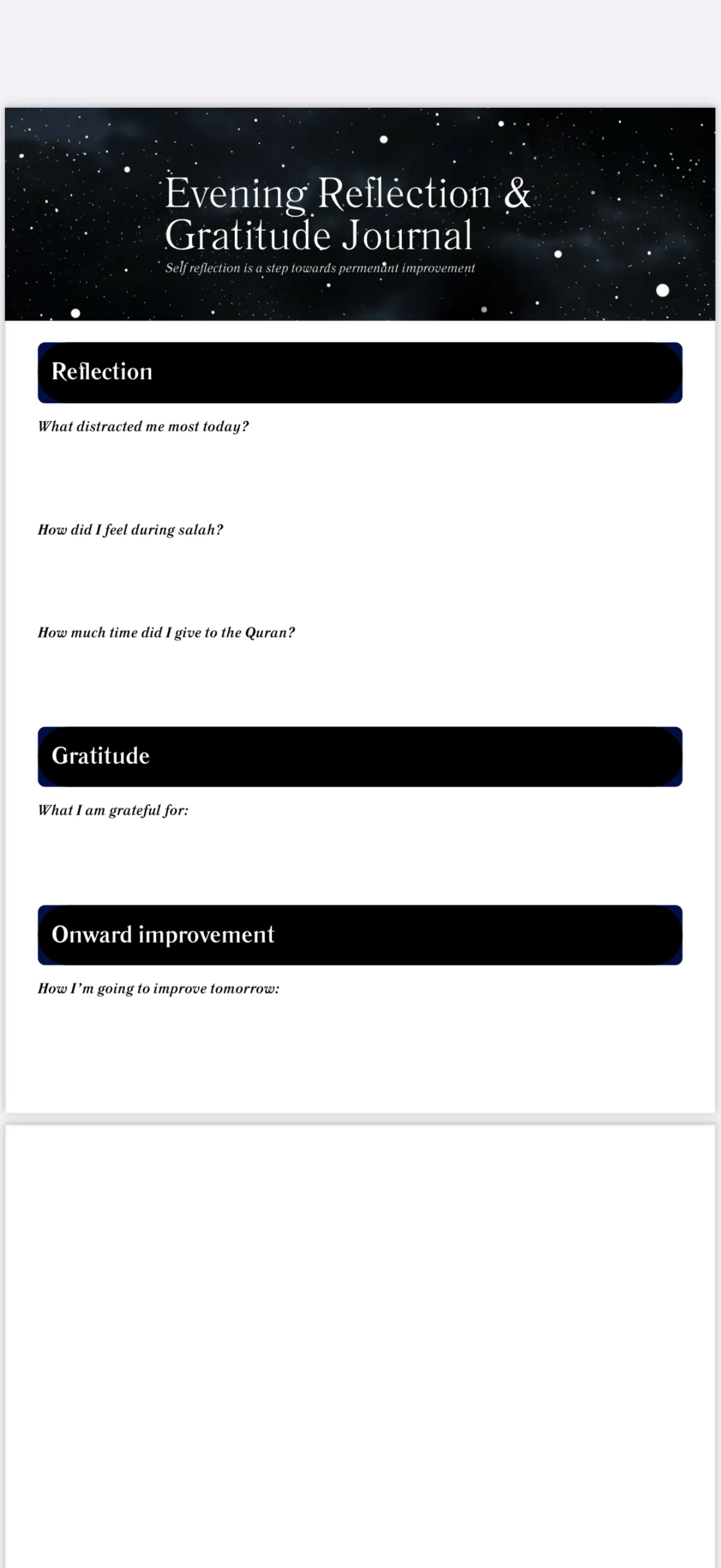 Physical tracking that makes your progress visible and your transformation real. Track screentime, prayers with actual focus, Quran read, and productive hours daily. What gets measured gets improved.