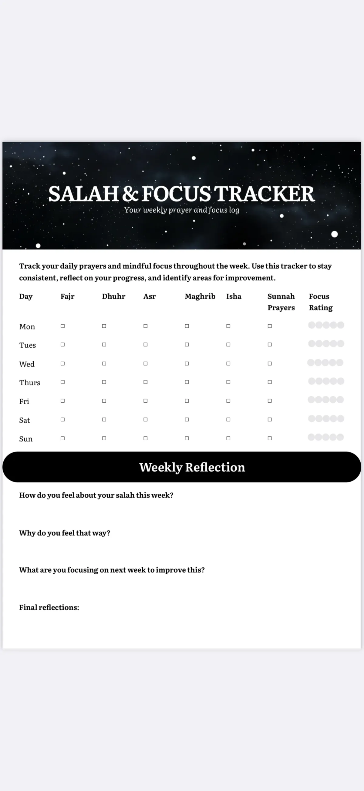 Monitor your prayer quality every single day. Rate your khushu for each salah. Identify exactly where focus breaks. Includes progression system for adding Sunnah prayers as attention span recovers.