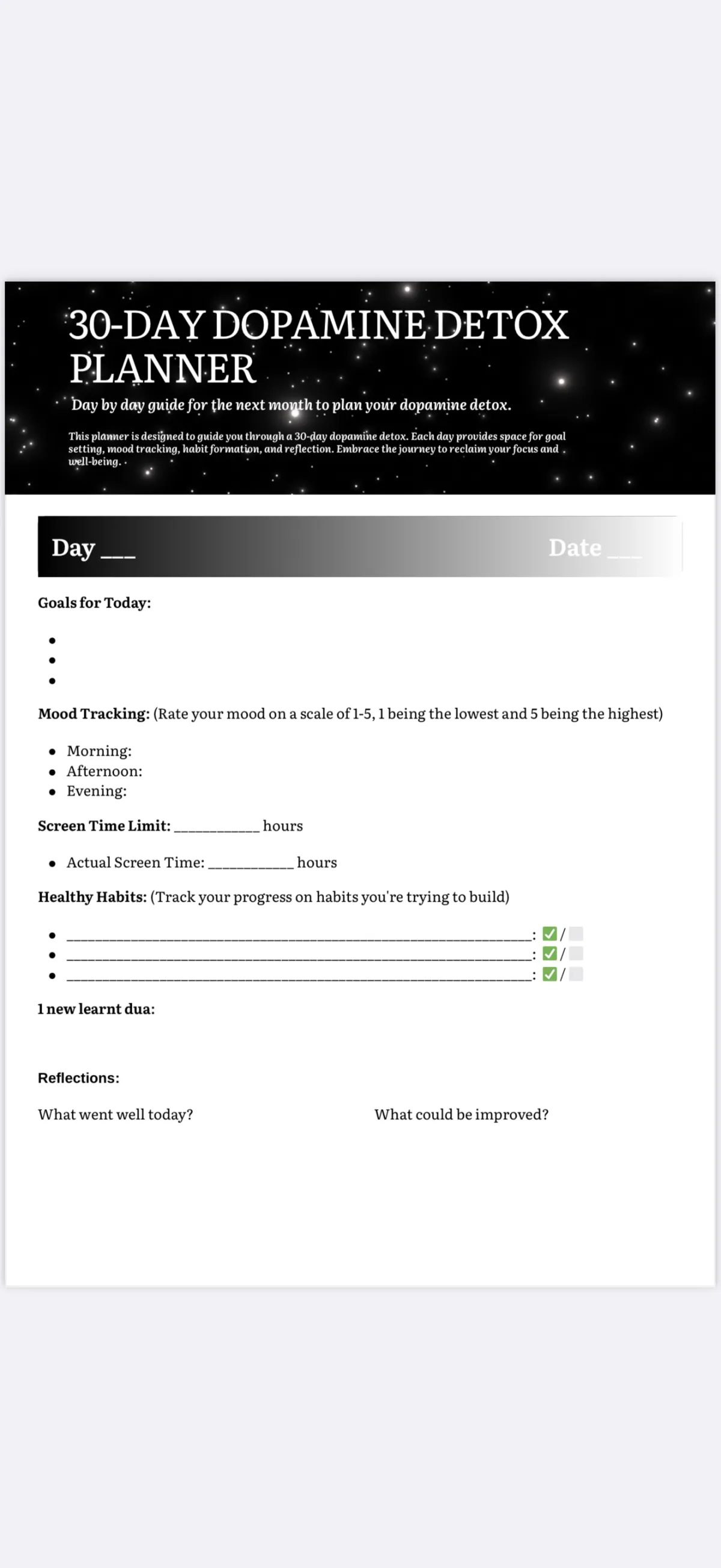 Printable daily templates for the entire month after your detox. Ensures transformation becomes permanent lifestyle. Includes weekly reviews and family accountability meeting guides.